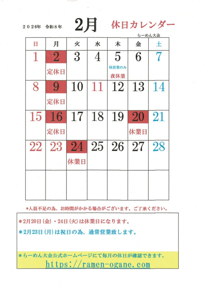 2月は、月曜日が定休日のほか、20日(金)・24日(火)は休業日になります。